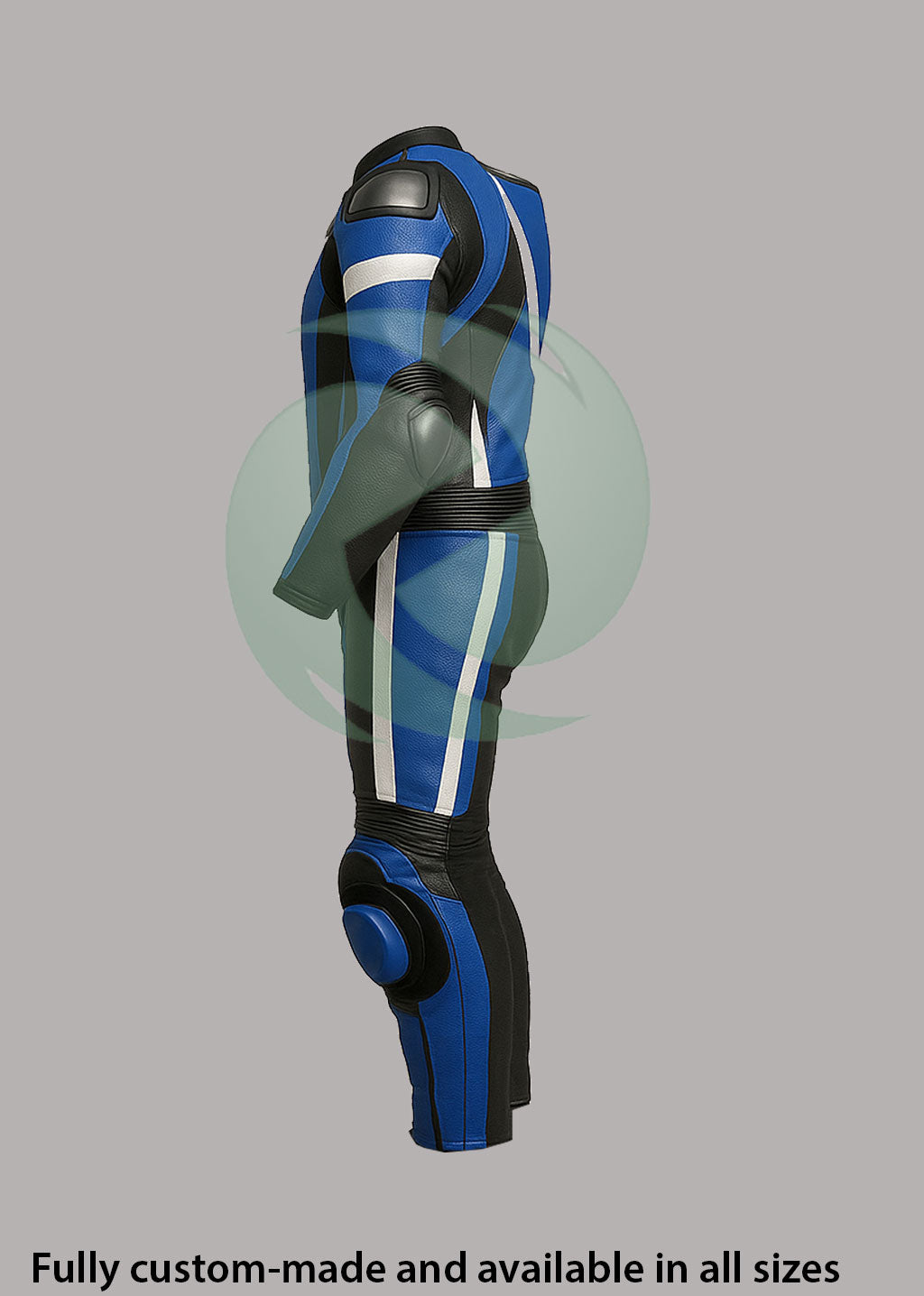 With its bold mix of black, blue, and white accents, this suit delivers a professional racing look while enhancing your visibility on the road. The design makes you stand out in low light or fast paced conditions, adding an extra layer of safety and style to your riding gear.